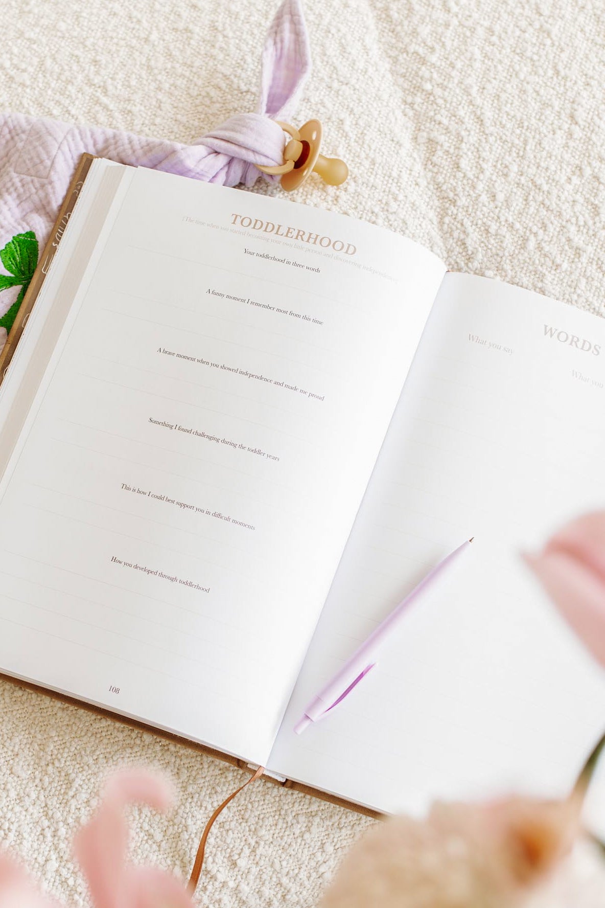 1 year old, 2 years old, 3 years old, 4 years old, First steps, Toddlerhood, Words you say, Quotes, Just Like me, Teething, Potty training, Growth chart, Your imagination, Funniest questions, A night away from home, Childcare