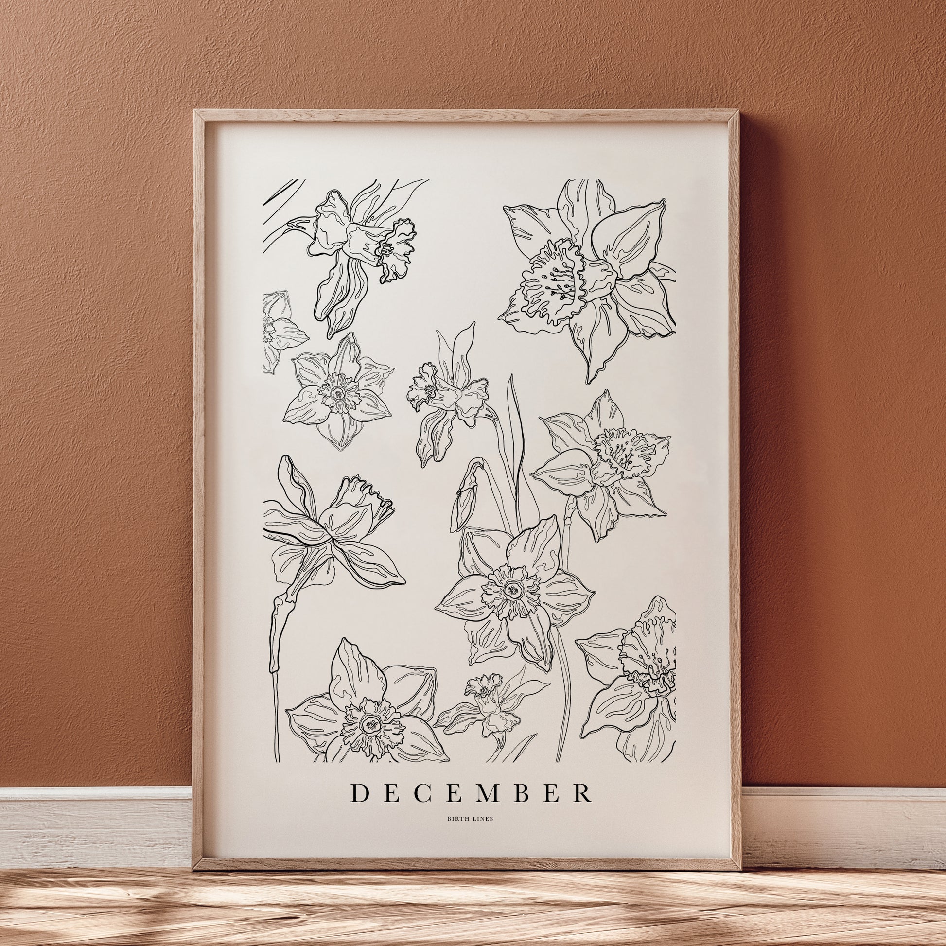 Hand-drawn birth flowers in the signature Birth Lines style, now available as posters! Each month has its own 'Birth Flower' that symbolizes that month. December's Birth Flower is the K amer daffodil.