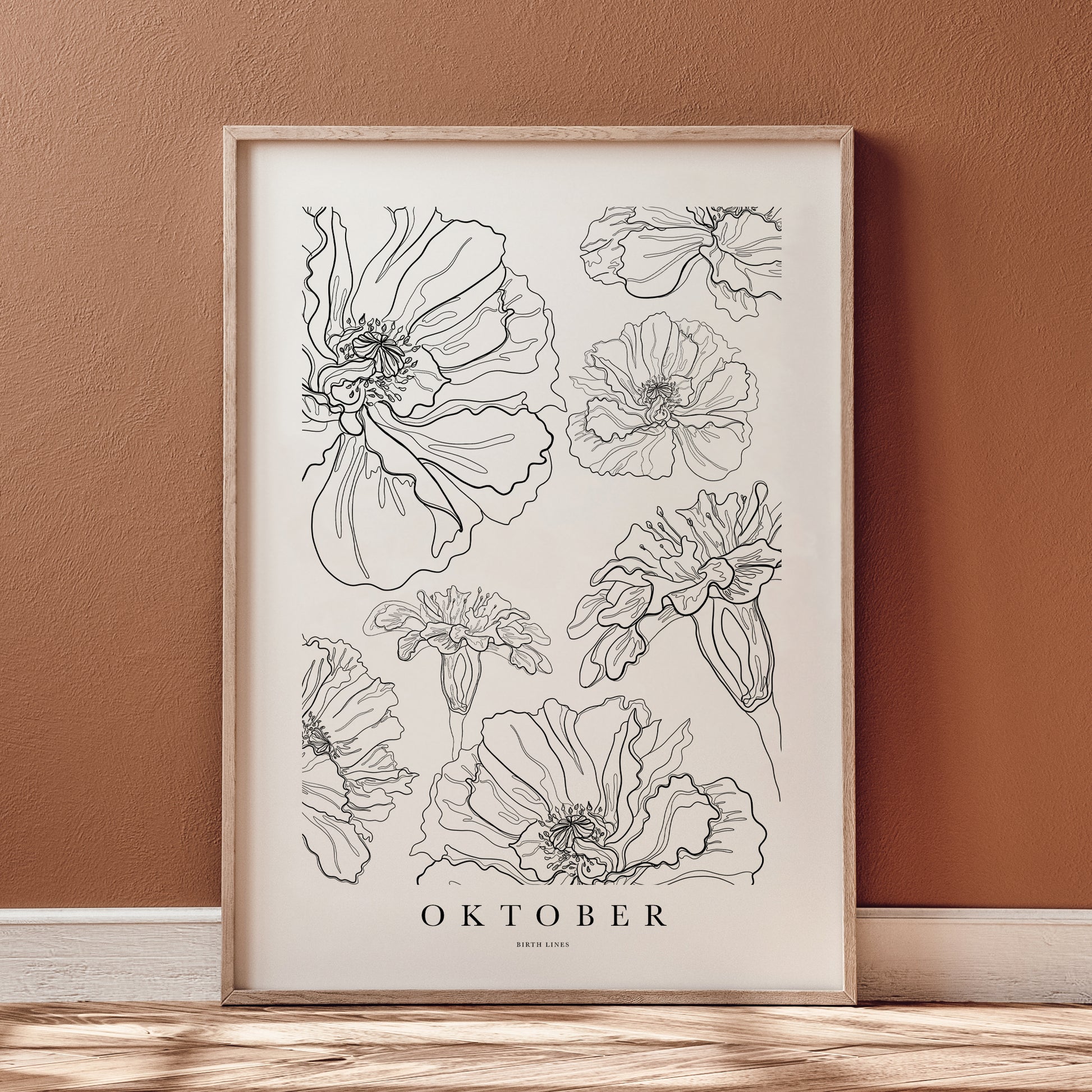 Hand-drawn birth flowers in the signature Birth Lines style, now available as posters! Each month has its own 'Birth Flower' that symbolizes that month. October's Birth Flower is the Marigold (Calendula) .