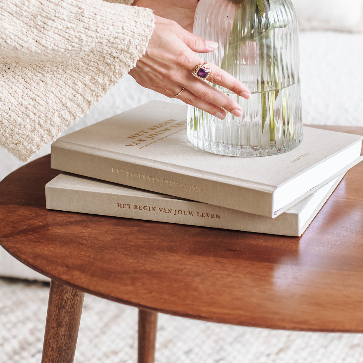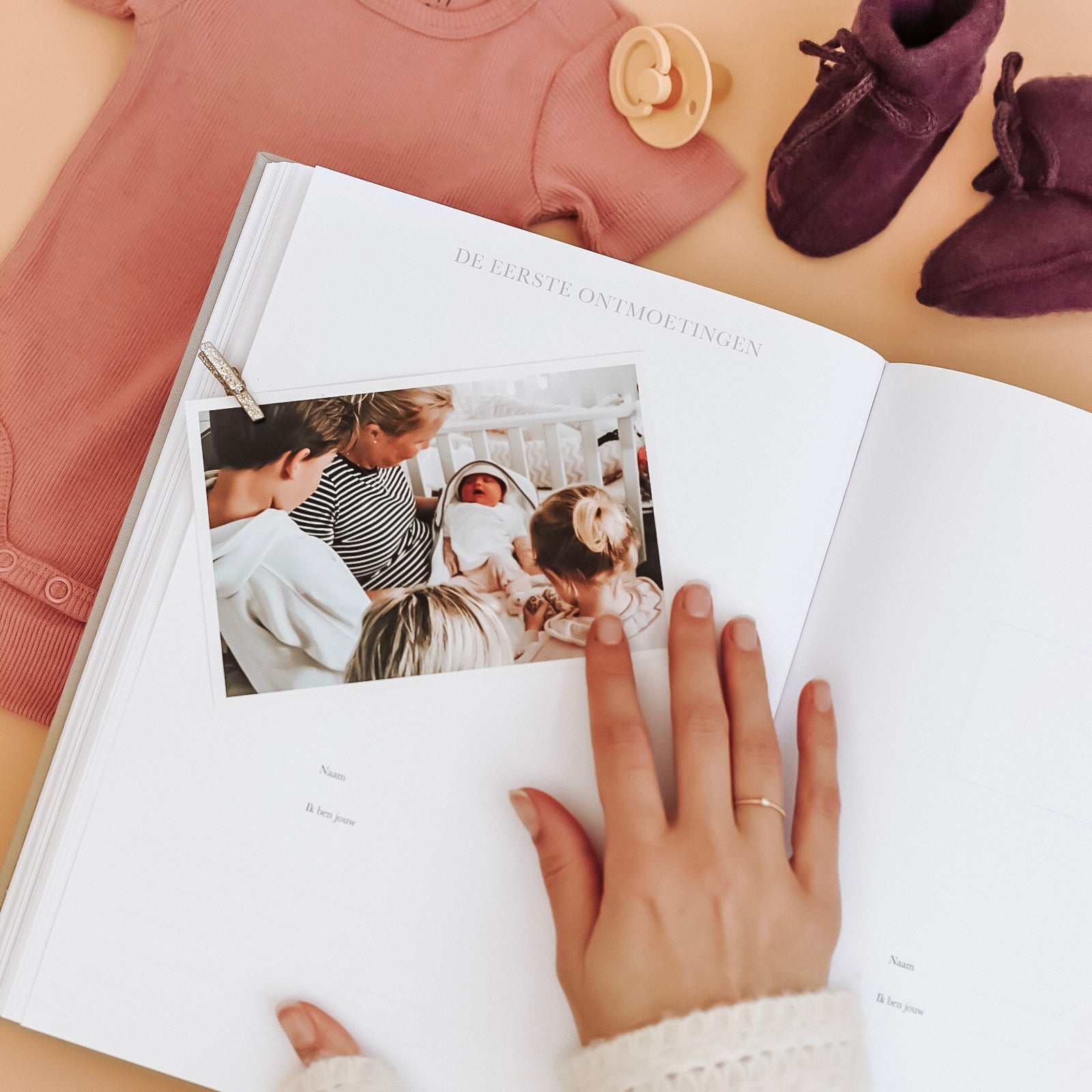 Waar je vaak een los zwangerschaps-, echo-, geboorte-, kraam-, eerste jaar- en familieboek koopt, zit in ‘Het begin van jouw leven’ alles gebundeld in één groot invulboek.