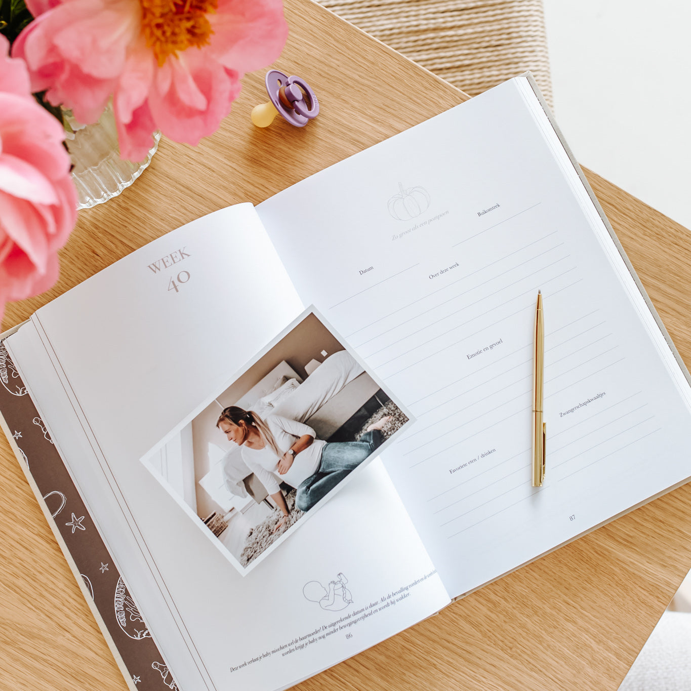 Het invulboek is professioneel gedrukt en bevat een luxe linnen kaft met goudfolie bedrukte tekst op de voorzijde, rug en achterzijde. Het is ontworpen in een minimalistische, gender neutrale en tijdloze stijl. Het gebruik van hoogwaardige kwaliteit maakt het een perfect cadeau en aandenken aan deze bijzondere tijd.